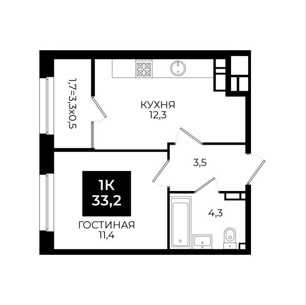 Площадь: 33,2 м²
