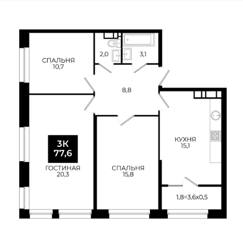 Площадь: 77,6 м²